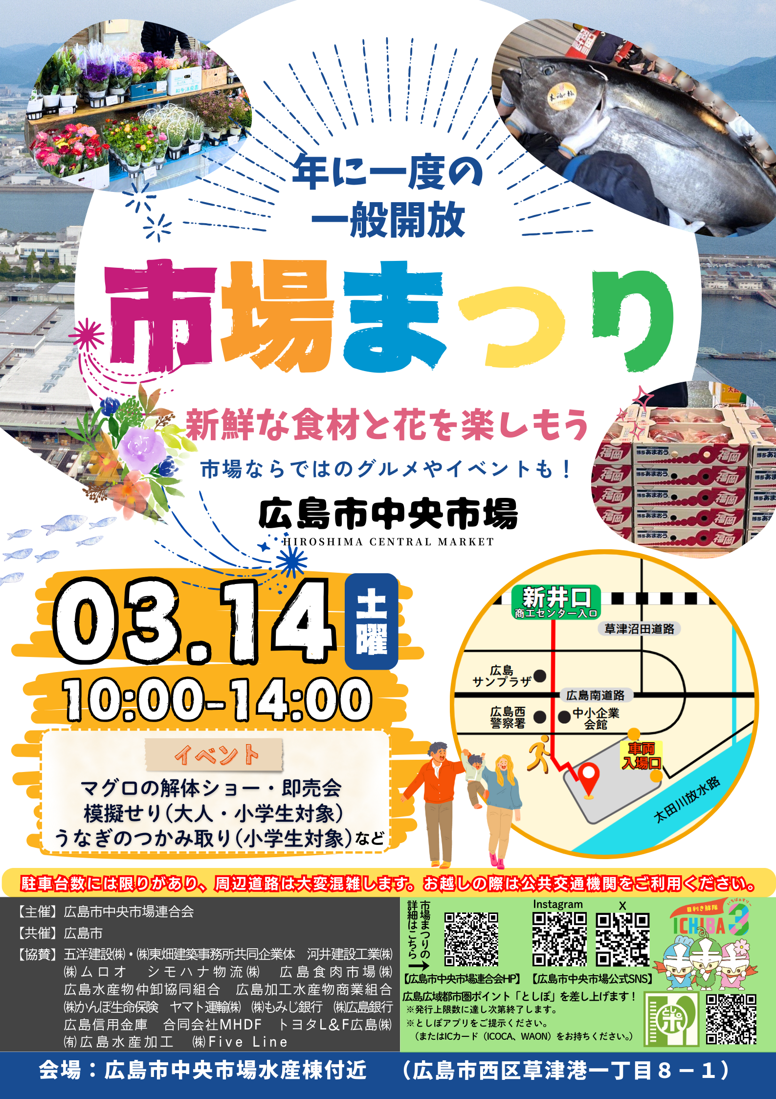 広島市中央市場が年に一度の一般開放! 市場ならではのグルメや体験イベントが楽しめる特別な一日。 マグロの解体ショー、模擬せり体験、うなぎのつかみ取りなど見どころ満載です。